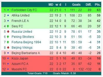 It was Forbidden City FC’s most important match of the season: the last match against the French in order to secure their first championship in the IFFC. The City FC lads faced a ninety minute tough fighting French LE A side who missed several good players including the important goaly Fefe who was on a business trip. The match started with as shock for Forbidden City FC: after just three minutes the French could score from a free kick of Alessandro Antiniconone (3.) the sudden 0:1 lead over the title contenders. The Africans who needed Forbidden City FC to tie or loose from the outside celebrated and shouted for the French team. Forbidden City FC was shocked and tried with all their fighting power to overcome the French LE defense but failed to construct their famous constructive play as they did most of the season, in this game Forbidden City FC fought for every centimeter while the French LE A did as well and denied the City lads to score and the first half ended 0:1 for the French LE A and this time Afrika Utd. had the upper hand in the championship race. In the second half the same picture: The French defense was like iron for City FC and the ball just don’t wanna go into the goal until the twenty one minutes before the end of the game: Daniel Tkack (69.) struck the 1:1 equalizer and five minutes his team mate Lao Cui added two goals (74. & 79.) within just five minutes to turn around the match for 3:1 for Forbidden City FC who now played the rest of the first half relaxed and used the absence of the real French keeper Fefe to add two more goals through Matt Dunn (82.) and Jochen Tenhagen (87.) to decide the match with a 5:1 victory after all. Congratulations goes to Forbidden City FC who afterwards partied until late nite in Luga’s in Sanlitun their deserved championship.