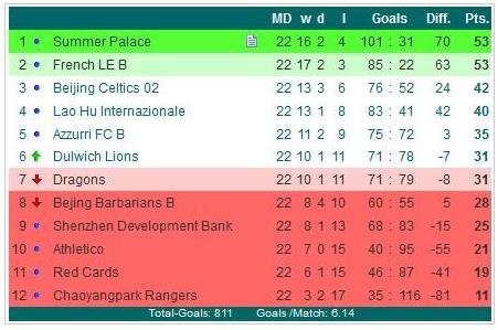 Summer Palace won convincingly with 5:1 over the Dragons and defended their No.1 position in the First Division. In the first half it was Ben Roberts (17.), Chris Lupton (22.) and Cui Yongzhou (26.) who all scored once for the 3:0 halftime lead for Summer Palace. In the second half the first goal was scored by the Dragons through Ryan Noble (46.) for 3:1, but that was all the Dragons could score in this match. On the other side for Summer Palace it was Alistair Russel who struck two more Summer Palace’s goals (63. & 69.) within just six minutes which made it 5:1 which was also the final score after ninety minutes.